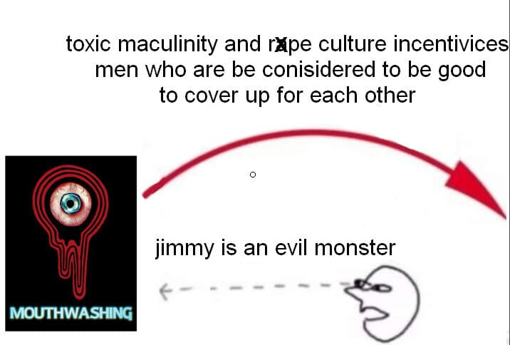 Mouthwashing nos coloca en el papel del agresor Jimmy y del perpetuador Curly y nos muestra a Anya desde esas dos perspectivas. Esta situación no nos la cuenta explícitamente, no. El juego va desenmarañando la información con una lentitud, a mi parecer, excesiva. Hasta que no sabemos que Anya está embarazada, no sabemos realmente nada de la situación, no entendemos por qué Jimmy actúa así y la pregunta de Anya sobre por qué no hay pestillo en las habitaciones pero sí en la sala médica pasa casi desapercibida. Y, aún con esa información, es complicado llegar a la conclusión de que ha sido agredida por Jimmy o incluso que el embarazo no es deseado. En los últimos minutos del gameplay vemos como Jimmy parece estar atormentado por el concepto de la paternidad pero podríamos pensar que es simplemente eso, que le da miedo ser padre, “asumir la responsabilidad de criar a un hijo” y ya.